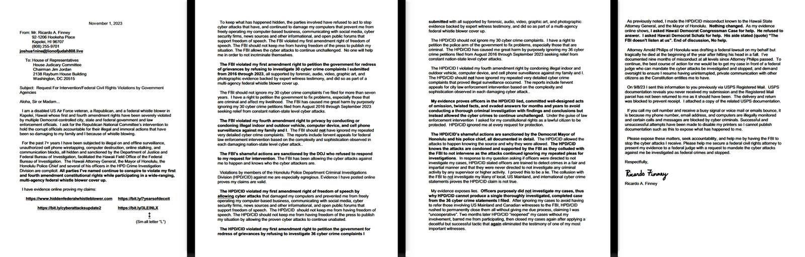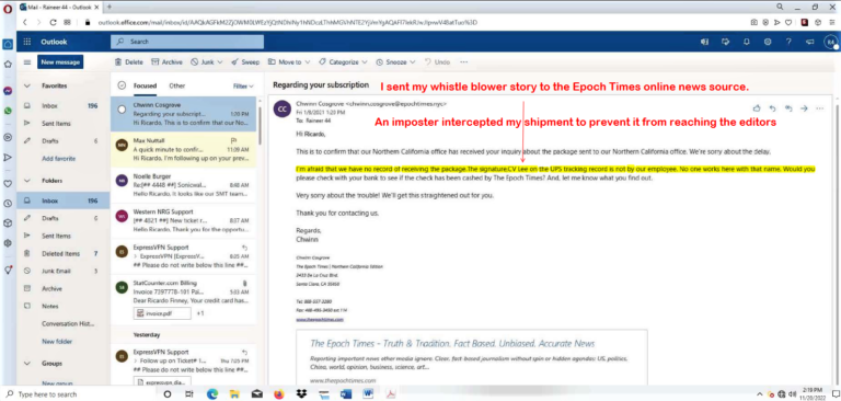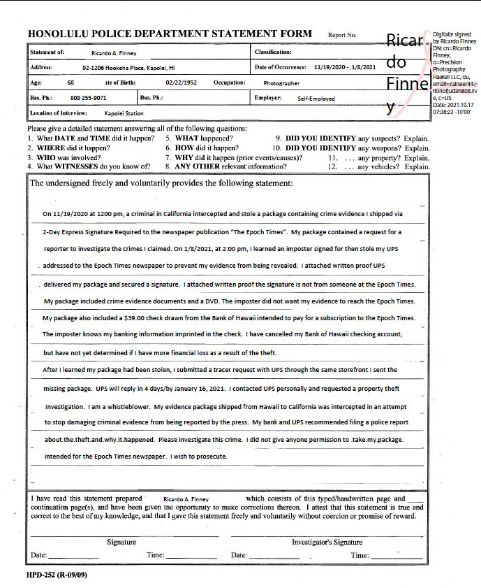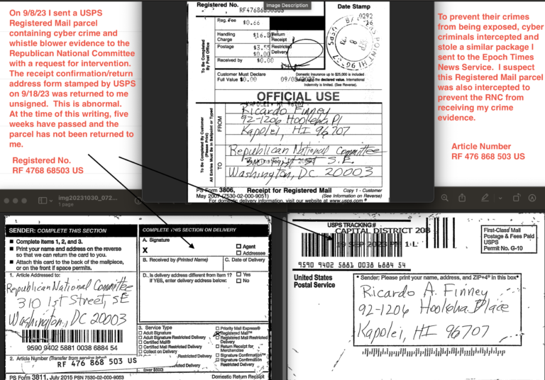 Cyber criminals intercepted and stole an evidence package I mailed to a reporter at the Epoch Times newspaper. My submission was taken by an individual not employed by the news source. Following my report the Honolulu Police Department refused to investigate the theft.
